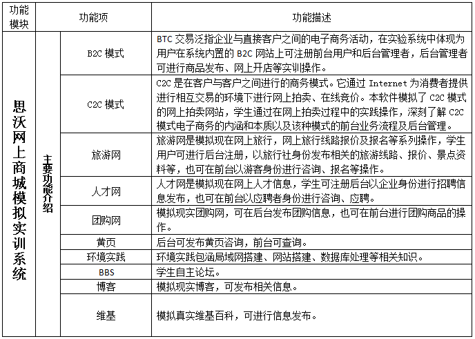 思沃網(wang)上(shang)(shang)商城模擬實(shi)(shi)訓系統(tong)(tong)充分考(kao)慮到了(le)試驗的(de)具體情況(kuang),系統(tong)(tong)針對(dui)網(wang)上(shang)(shang)商城模擬實(shi)(shi)訓進行(xing)相關配(pei)置,學生可在(zai)系統(tong)(tong)中體驗網(wang)上(shang)(shang)B2C、C2C模擬商城開店實(shi)(shi)訓并結合(he)網(wang)絡環境的(de)搭(da)建、數據庫(ku)運用(yong)知識、團購網(wang)、在(zai)線旅(lv)游網(wang)、在(zai)線人才網(wang)等(deng)進行(xing)多元性(xing)的(de)實(shi)(shi)訓系統(tong)(tong)。