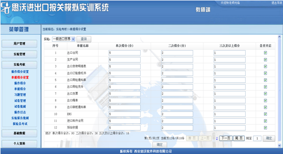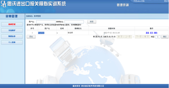 軟件(jian)的(de)功能概(gai)述:軟件(jian)分(fen)管(guan)理員、教(jiao)師和學生(sheng)三個用戶角色。由管(guan)理員進(jin)行(xing)教(jiao)師管(guan)理。教(jiao)師通過(guo)建立(li)自(zi)己所(suo)屬(shu)(shu)的(de)班(ban)級和學生(sheng),對各(ge)自(zi)所(suo)屬(shu)(shu)的(de)班(ban)級和學生(sheng)有管(guan)理權限。學生(sheng)端分(fen)為外(wai)貿公司和報關行(xing)進(jin)行(xing)實驗(yan)。