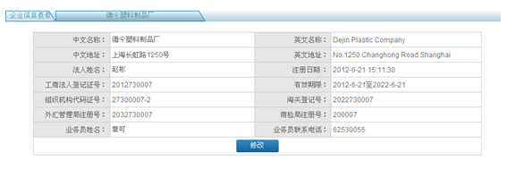 企(qi)業信(xin)息中(zhong)工商法人登(deng)記證號、組(zu)織機構代碼證號、外匯管理局注冊(ce)號、有(you)效期限、海(hai)關登(deng)記號和商檢局注冊(ce)號在企(qi)業注冊(ce)完成后自(zi)動(dong)生成。