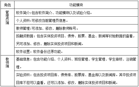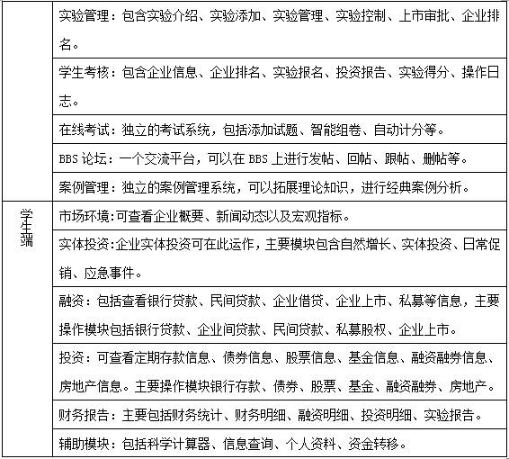 投融(rong)資(zi)決策(ce)實驗是由學生(sheng)扮演各種企(qi)業(ye),教師給(gei)定企(qi)業(ye)的(de)初始資(zi)金(jin)(jin),分為固定資(zi)產(chan)和流動資(zi)金(jin)(jin)兩部分,學生(sheng)可以合理分配流動資(zi)金(jin)(jin),利用銀(yin)行(xing)存款、銀(yin)行(xing)貸款、債(zhai)券(quan)、股(gu)票(piao)、基金(jin)(jin)、融(rong)資(zi)融(rong)券(quan)、房地產(chan)、企(qi)業(ye)間貸款、民間貸款、私募(mu)股(gu)權、企(qi)業(ye)上市等投融(rong)資(zi)手段(duan),積累實體投資(zi)資(zi)金(jin)(jin)。