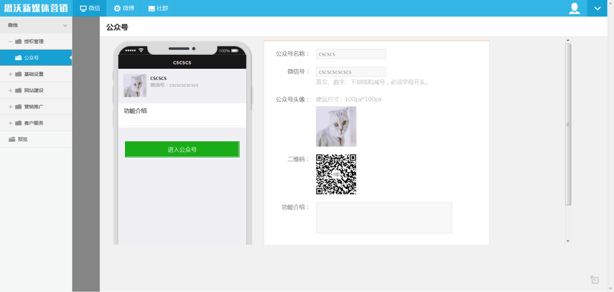 思沃(wo)新(xin)媒(mei)體營(ying)(ying)銷(xiao)(xiao)模(mo)擬實(shi)訓平臺系統模(mo)擬了真實(shi)的(de)新(xin)媒(mei)體營(ying)(ying)銷(xiao)(xiao)環境,提供(gong)包括(kuo):微(wei)信營(ying)(ying)銷(xiao)(xiao)、微(wei)博營(ying)(ying)銷(xiao)(xiao)和(he)社(she)群營(ying)(ying)銷(xiao)(xiao),用(yong)戶根據該(gai)教學軟件系統提供(gong)的(de)營(ying)(ying)銷(xiao)(xiao)模(mo)塊(kuai)進行(xing)營(ying)(ying)銷(xiao)(xiao)操作,新(xin)媒(mei)體營(ying)(ying)銷(xiao)(xiao)主要以微(wei)信公(gong)眾號(hao),微(wei)博,社(she)群這三種營(ying)(ying)銷(xiao)(xiao)模(mo)式為主進行(xing)實(shi)訓。