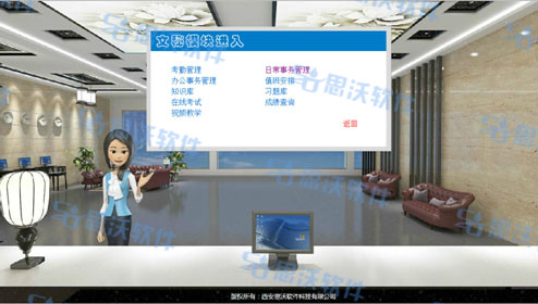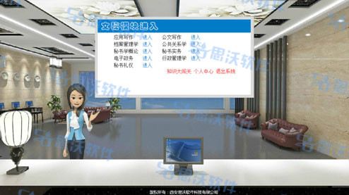 思沃文(wen)(wen)秘虛擬(ni)仿(fang)真實訓系統是我公(gong)司依據文(wen)(wen)秘專業相關課程(cheng),結合3D動(dong)態場景技術,引入實際(ji)文(wen)(wen)秘工作中的(de)(de)相關案(an)例,融合開發的(de)(de)一(yi)款針對文(wen)(wen)秘專業實訓的(de)(de)應(ying)用型教學平臺(tai)軟件。